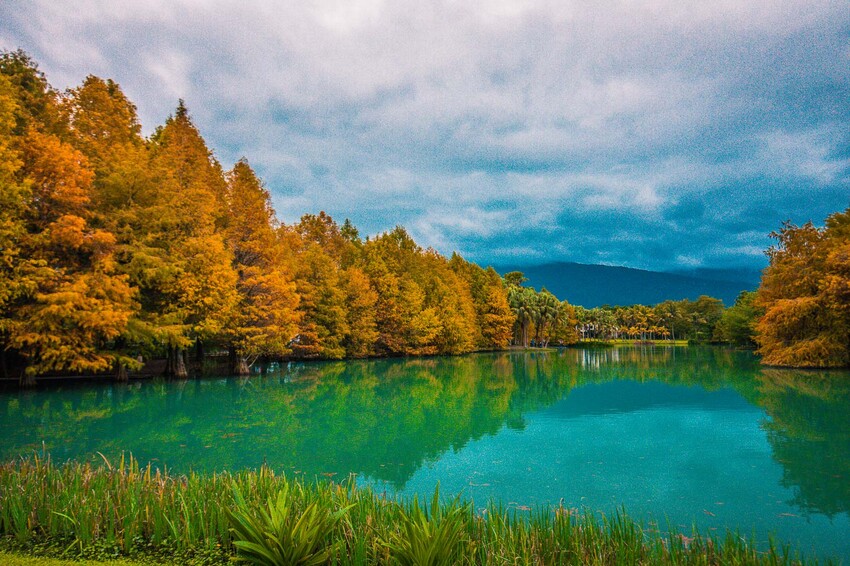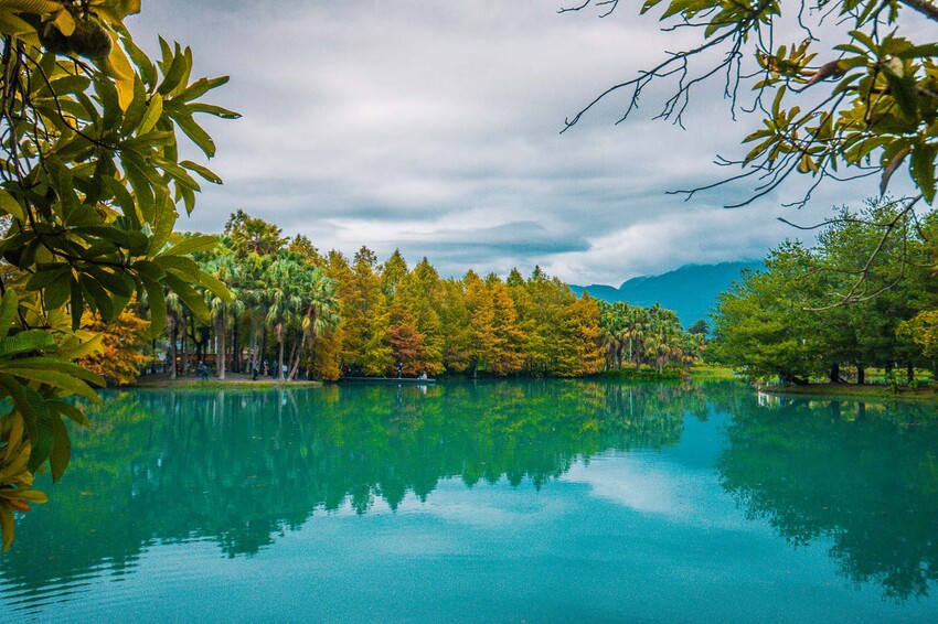 買了門票就可以進去大拍特拍囉!走進雲山水,這美景實在夢幻,正如其名『夢幻湖』!藍天白雲搭配碧綠湖水,周邊還有逐漸轉紅轉黃的落羽松,難怪大家都想來這邊拍照