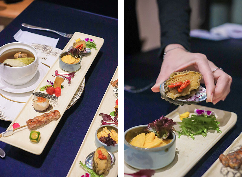 前菜先以湯品暖暖胃,湯頭是用老母雞翅肉、金華火腿、枸杞紅棗等煨煮8小時而成,暖流入口甚是清香鮮甜,其中的螺肉大塊又彈牙,一度還以為是不是上菜的時候介紹是不是錯了,其實是鮑魚湯呢!