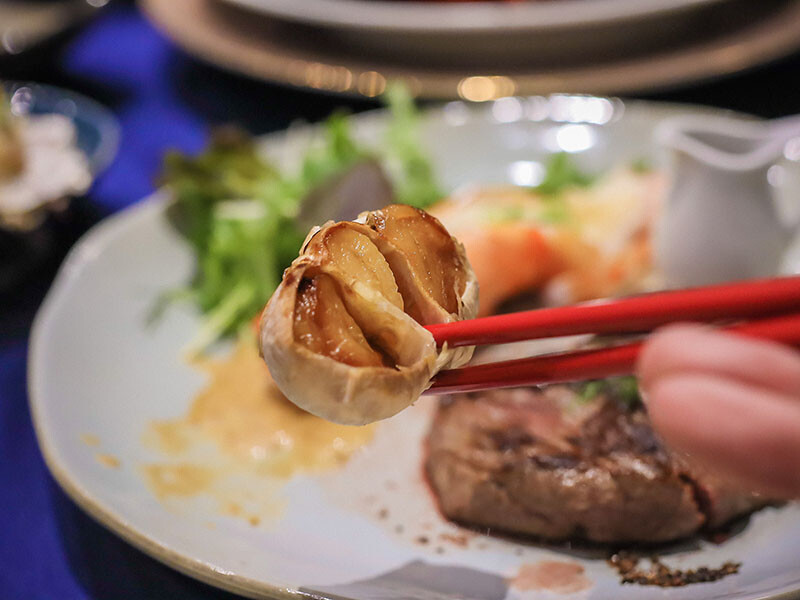 品味菲力除了玫瑰鹽品調味,還有烤蒜頭搭配,牛排搭配烤蒜可是經典吃法;小杯魚露則是給大蝦調味,更能襯托出鮮香滋味;一旁搭配的生菜是BABY菜,品味期最鮮嫩的時刻。
