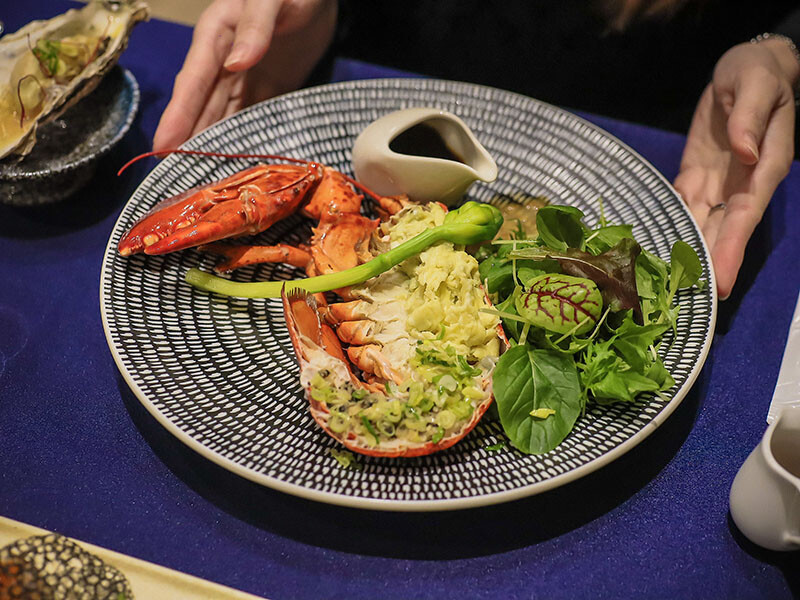 不僅精選主食食材,從BABY生菜作為搭配就明瞭九里松在選食上非常用心;波士頓龍蝦佐以松露一同清蒸,松露的香氣與龍蝦海味襯托得肉質更為鮮美,搭配花蛋與晚香玉筍,口味的層次上Q彈中多了滑嫩與清脆。