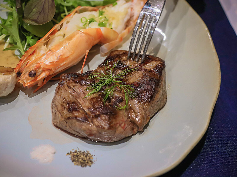 主食上場,選自最高級牛腰脊肉,屬瘦肉多、油脂少且沒有筋的部位,主廚推薦以3~5分熟為最佳品味時刻,一口咬下滲出香甜肉汁;光是草蝦就這麼大隻,食材等級挑選相當好,以簡單的蒜泥、青蔥剖背清蒸入味,輕輕一剝就能拉出整尾蝦肉,女孩們吃蝦也不用等男友剝蝦,吃的就是西餐的品味與優雅。