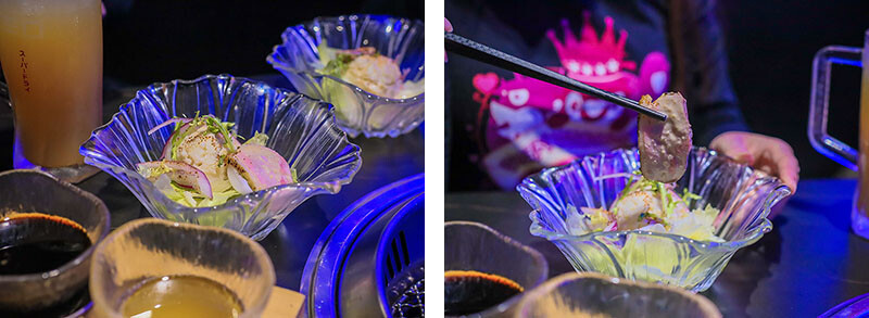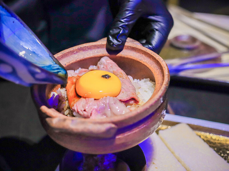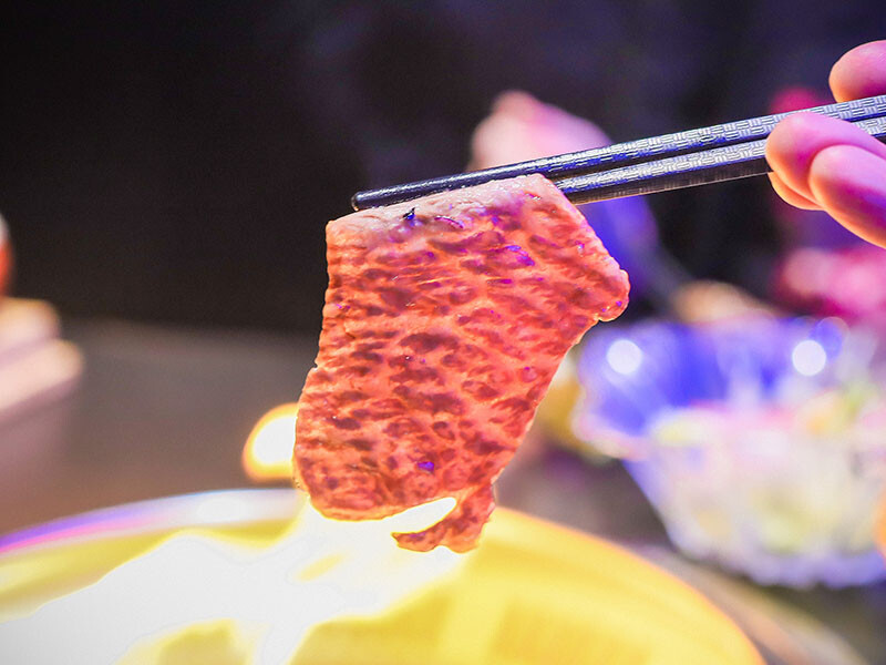 大片的日本A5和牛沾著月見享用你說香不香!服務人員將A5和牛烤至完美,疊於越光米上倒入生蛋黃與醬汁,滑落的一瞬真是好Q,和牛肉片選用紐約客的部位,適薄的厚度沾染蛋液口感更香滑,醬汁與松露的提香,第一次在燒肉店把米飯吃光光。