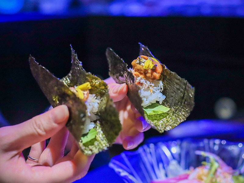 以木盒海苔包裹海膽、生牛肉手卷呈現,其中松葉蟹肉、金箔與食用花作為味覺與視覺點綴,相當奢華且鮮味滿點;海苔容易受潮軟化,建議上桌就馬上吃喔。