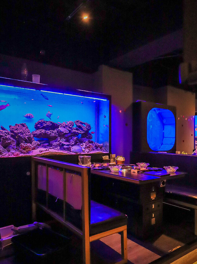 左側式特別的洞穴座位區,多些隱密性也有更寬廣的視野可以觀賞水族小魚。店內有設置養殖缸,提供新鮮的海產。