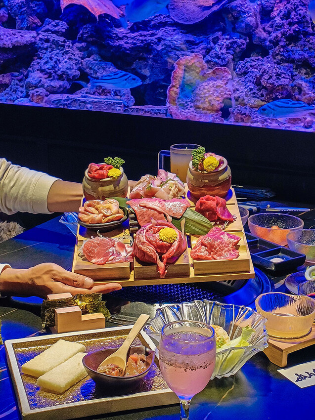 美乃斯的巷子裡怎麼會這麼多人,原來大家都是來吃山上走走日式無菜單燒肉專門店,推開大門一見海底盛景各位一定會喜歡!日式燒肉精緻化,從沙拉、前菜開始品嘗,肉品九宮格一次品味多種肉品,日本A5和牛、澳和扇子肉、雞松阪,月見和牛丼更是令人回味再三,當月壽星再送奢華的金箔霜淇淋,金光閃閃滿足視覺與味覺,奢華品山林、賞水族雙享受。