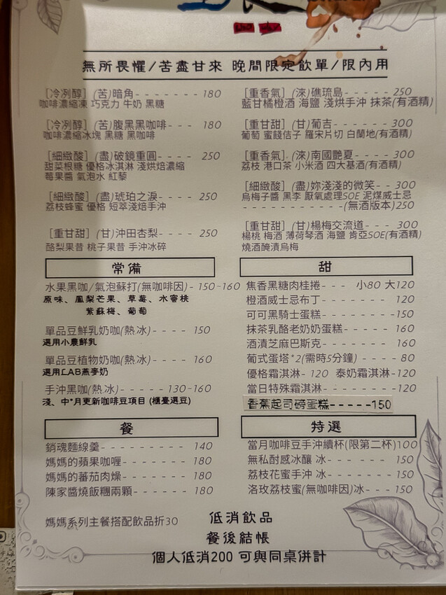 - 低消飲品 餐後結帳 低消200元 可與同桌併計