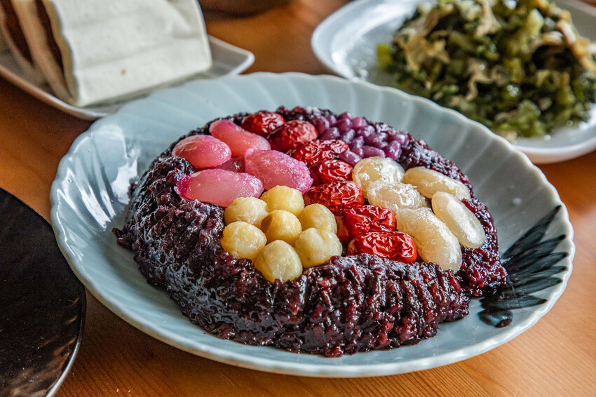 開運紫米八寶飯,家裡有小朋友可以買這個,香氣誘人且味道微甜,質地黏稠但不會讓人感到膩,以紫米為基底,其中含有豐富的花青素和鐵質,並融合了各種色彩繽紛的果乾、蓮子、紅棗等配料,使其營養價值極高,非常適合全家大小一起享用的經典中式甜品