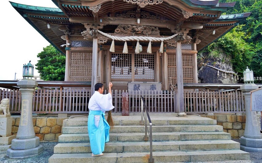 神社人員正在清潔打掃中