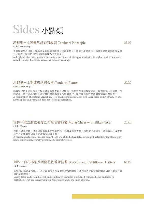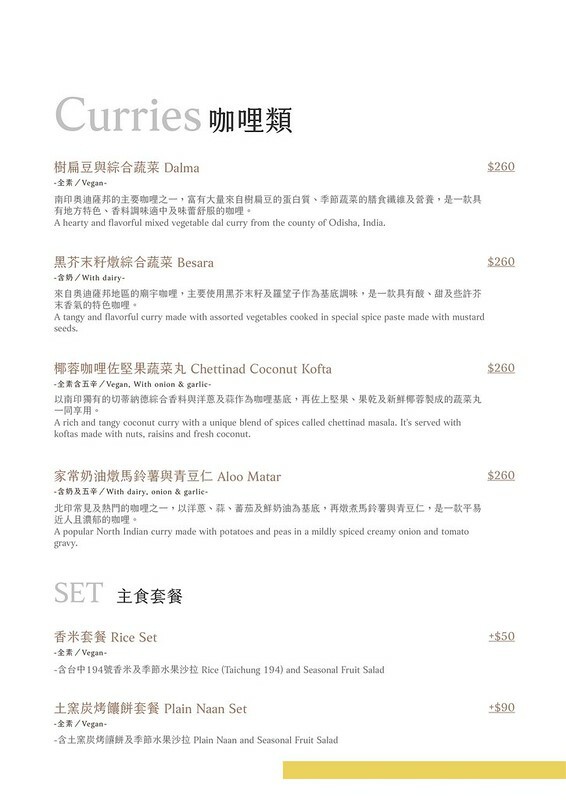 完整餐點資訊點這裡/低消 $300/人 ,點咖哩追加點飲料可折抵$20 ,只供應蔬食/Vegan,不吃五辛者提前告知,部分餐點含奶。