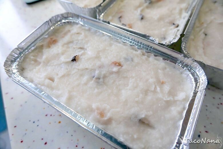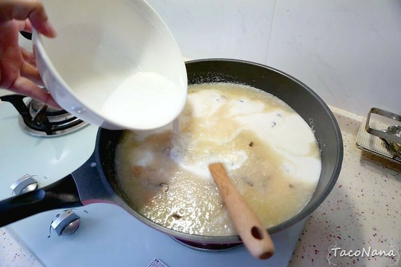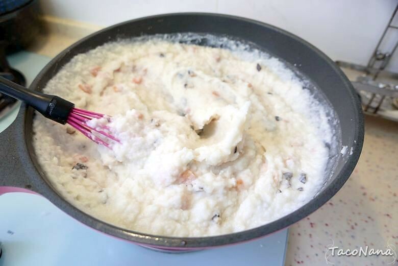 記得加入粉漿前先關火,倒入攪拌均勻之後再開中小火,開火後要一直攪拌,溫度越高,粉漿開始凝結,你會發現越來越難攪動,慢慢形成泥狀!
