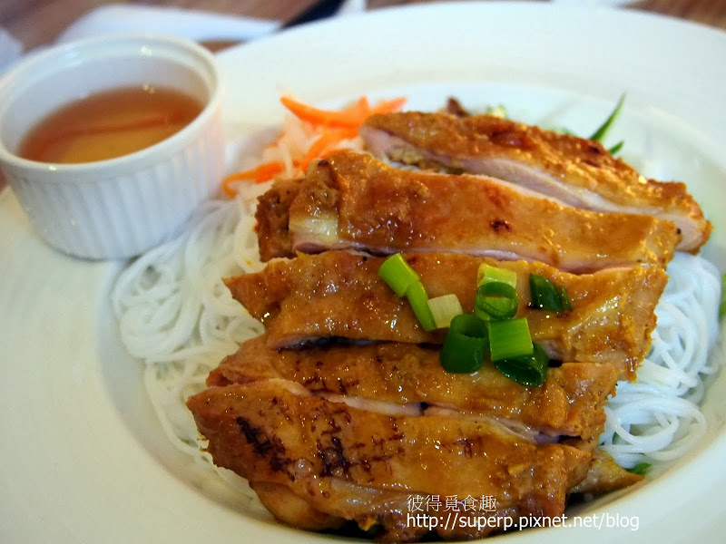 碳烤香茅雞腿排檬$165(烤過的雞腿排跟法國烤雞肉麵包用的是一樣的,香嫩夠味到不行。搭配米線,下面鋪了生菜,要吃時把魚露淋上去,攪拌一下即可。我個人非常喜歡這種搭配,只可惜覺得他們的魚露味道太單純,如果有加其他的醬料,豐富一下味道的話,這道就是大推了。不過,光是這樣吃,爽度就覺得頗高,而且感覺熱量沒有太高。我算是蠻常點這道的。)