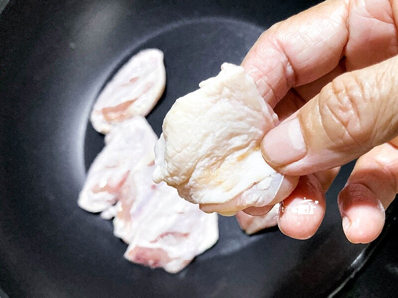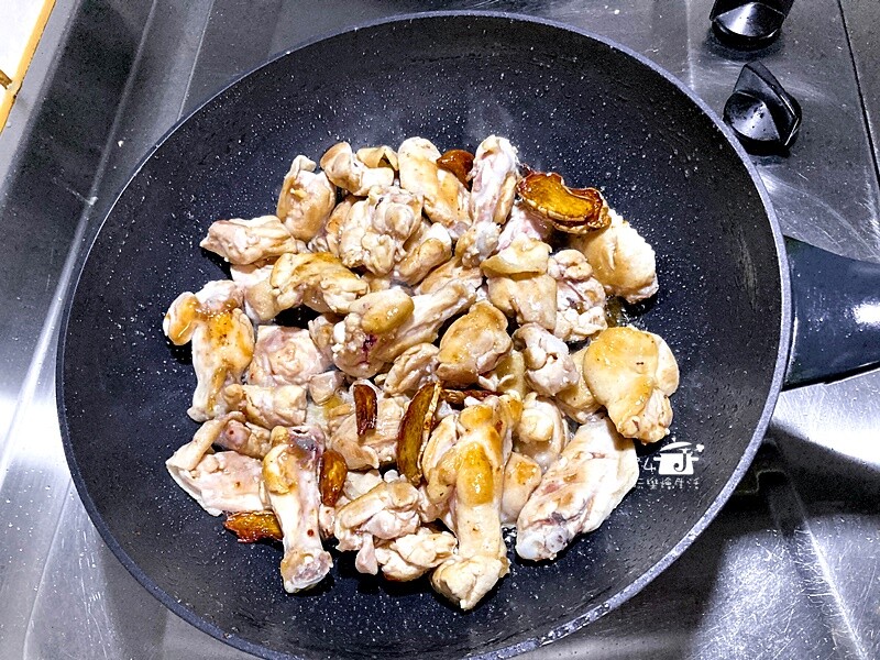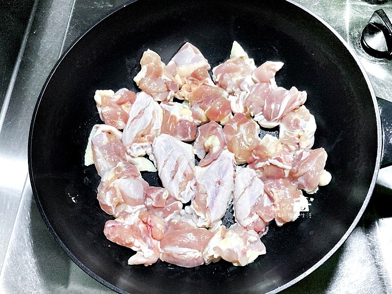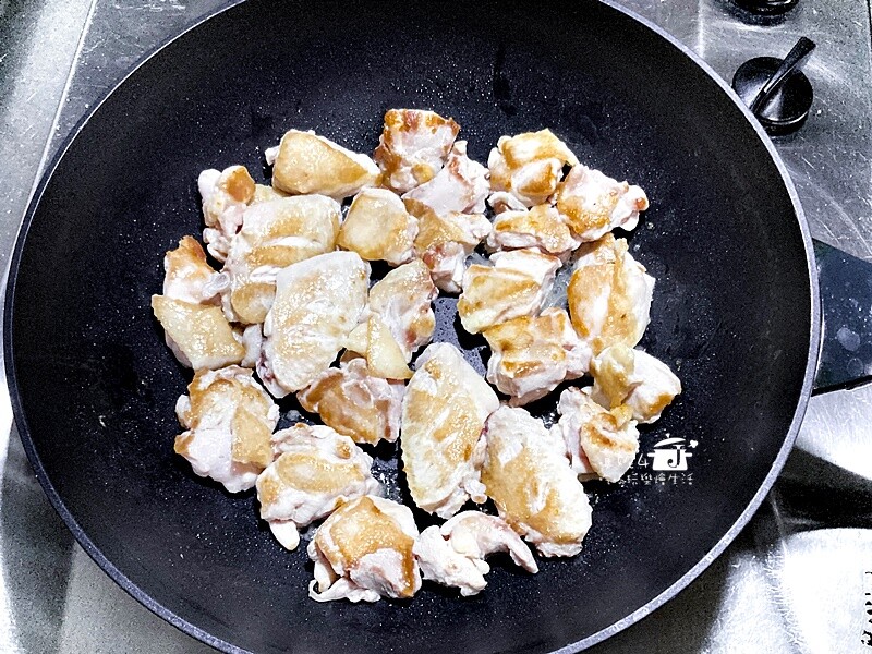 1.鍋裡不用放油,雞肉塊的皮面朝下,用中小火煎到兩面金黃(不用熟)後起鍋