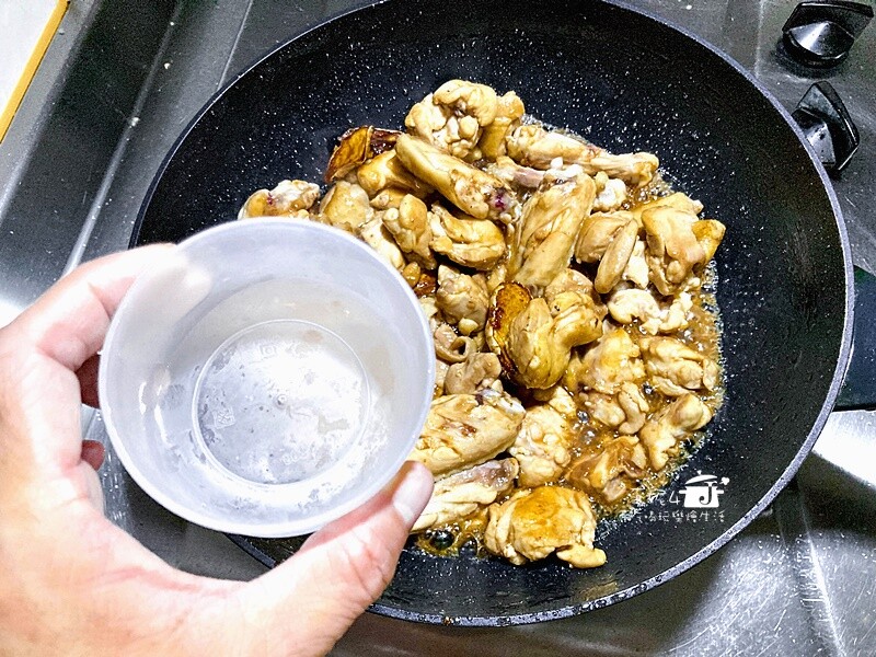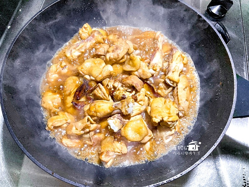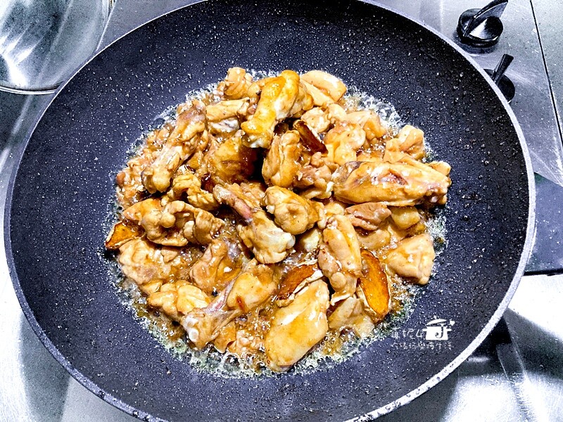 4.蓋上鍋蓋轉中火把雞肉塊燜煮到均勻上色並微收汁的入味狀態