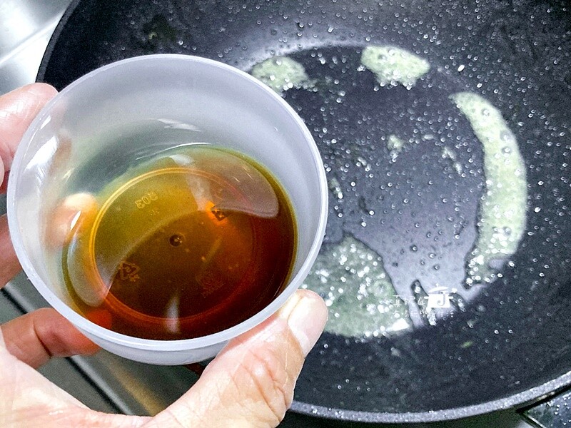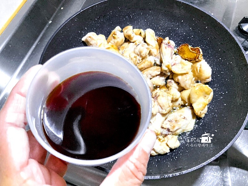 3.倒入醬油和米酒後再次翻炒均勻,讓肉塊們均勻吸收醬汁的風味