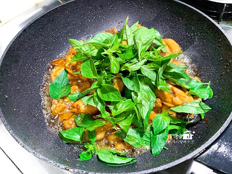 5.放入九層塔再拌炒幾下-熄火-盛盤-上菜-