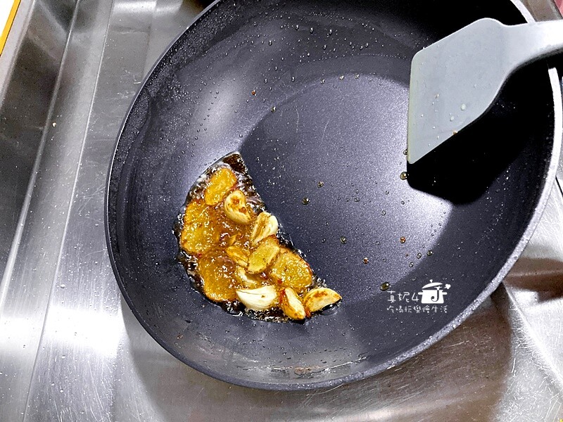 因為油量不多,把炒鍋傾一邊集中油量和火力煸薑片蒜頭比較快