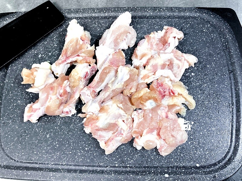 小雞腿先把肉和翅骨切為兩塊,翅骨用刀劃開