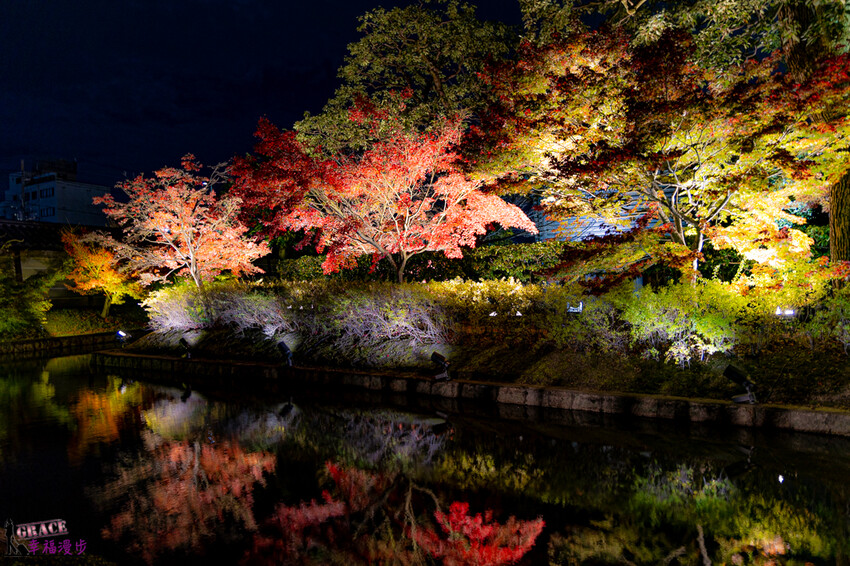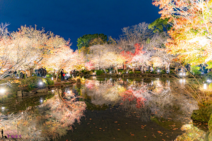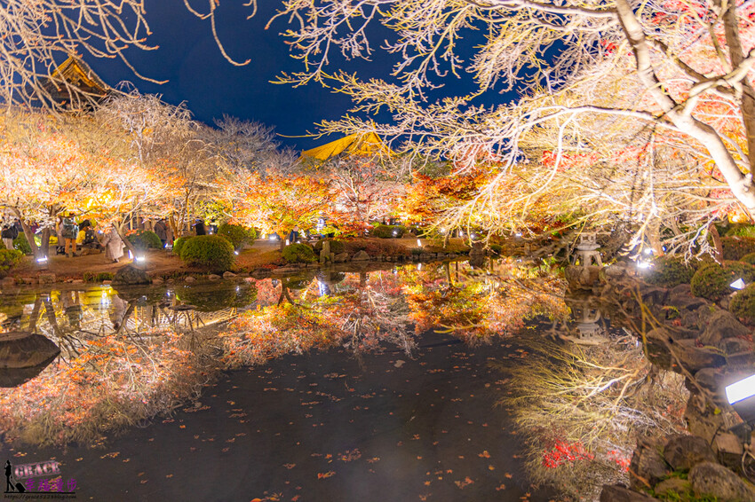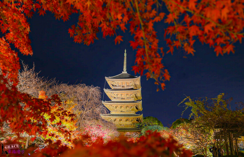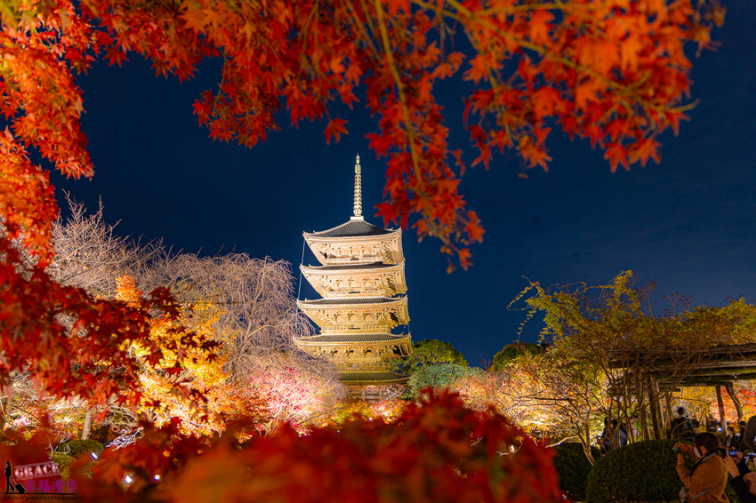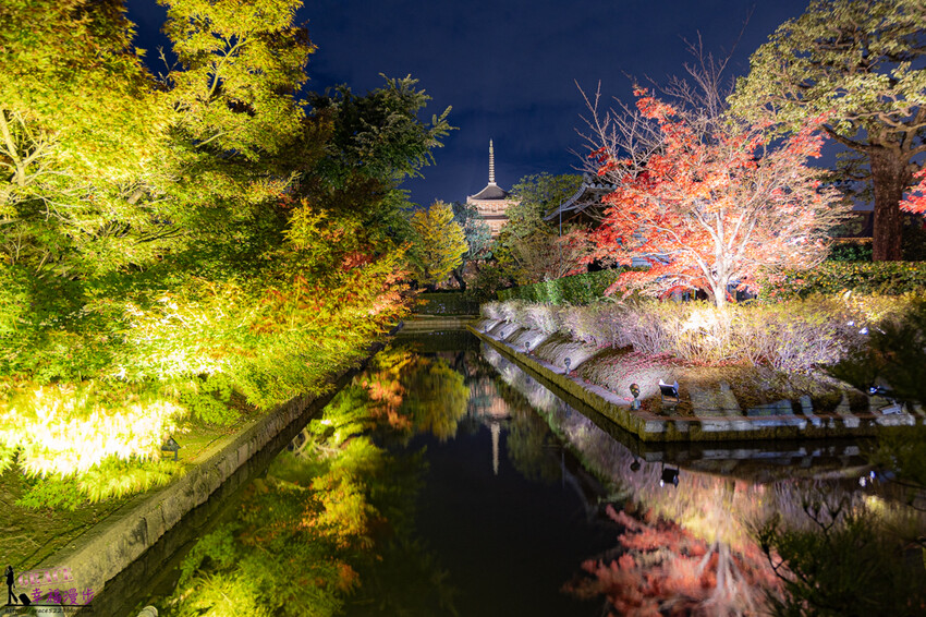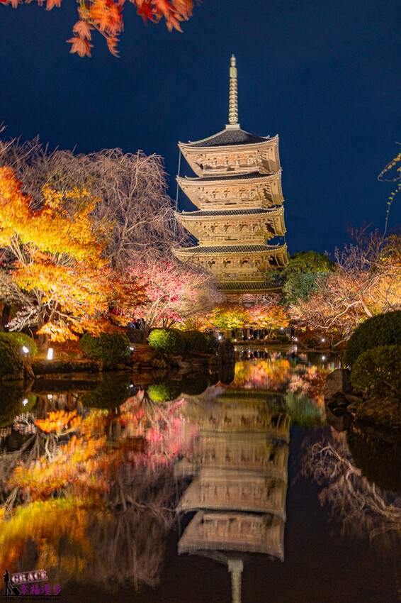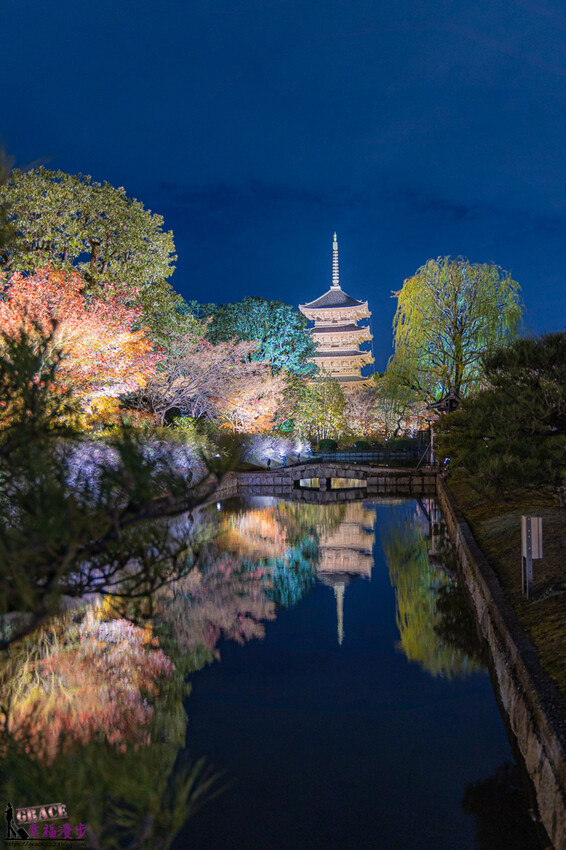 來到京都賞楓除了白天外夜晚還是有夜楓, 東寺 有著京都最美的夜楓,那當然要來欣賞一下啊!從京都車站搭市營16號公車約10分鐘就可以抵達,楓葉季時的夜楓門票價格是日幣1000元,買好門票排隊等候進入,踏進寺院後就被這倒影給吸引了,沒有過多的霓虹燈光,單純的白光投影就很值得欣賞了。