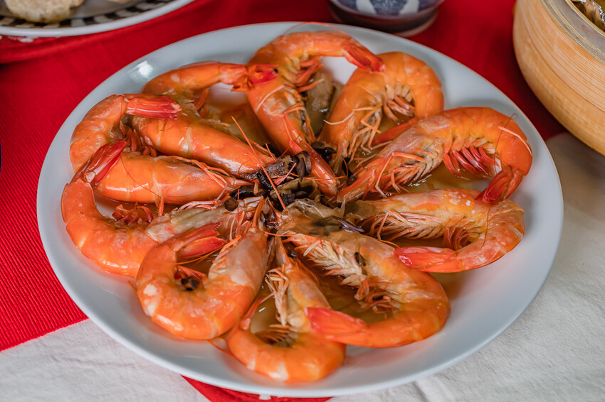 選用肥美Q彈的大白蝦,以紅棗、枸杞等多種中藥材熬出甜味,再加入紹興黃酒,充滿酒香而沒有酒精,大人小孩吃了都好滿意,大白蝦肉質鮮嫩,經過紹興酒的滋味提升,更顯香醇美味。