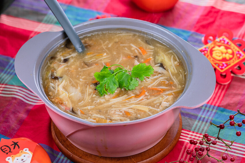 雖說是魚翅羹,但現在應為環保生態的潮流,所以大多人都不吃魚翅了,取而代之的是更新豐富的食材,這羹湯裡面有蝦仁、肉絲、筍絲、魷魚、花枝、魚漿、扁魚、香菇、金針菇、人參、木耳等十一道食材,湯頭鮮甜、濃郁可口。