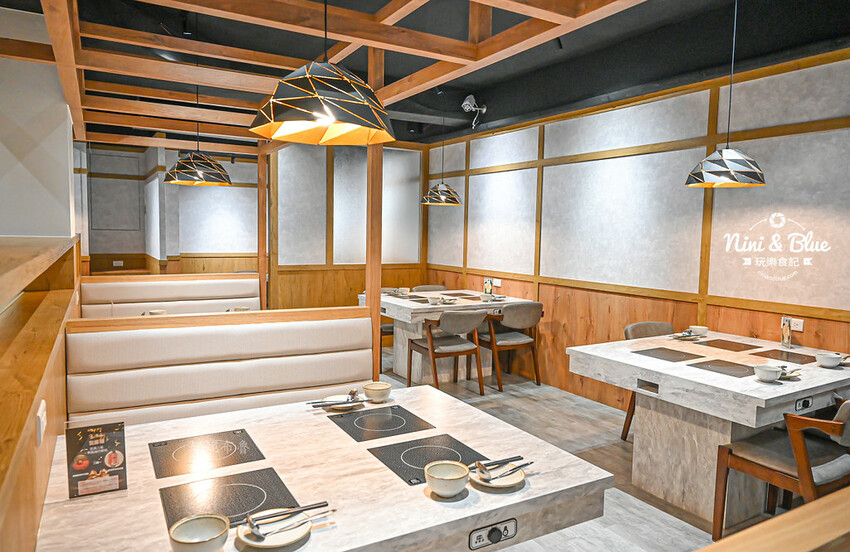木質調的日式空間搭配灰色沉穩色調,整體俐落優雅,採一人一鍋用餐方式,內崁式電磁爐、無明火,帶小朋友來用餐也很方便。更貼心的是,在每一個桌子旁都有3孔插座可用,不用擔心手機沒電。