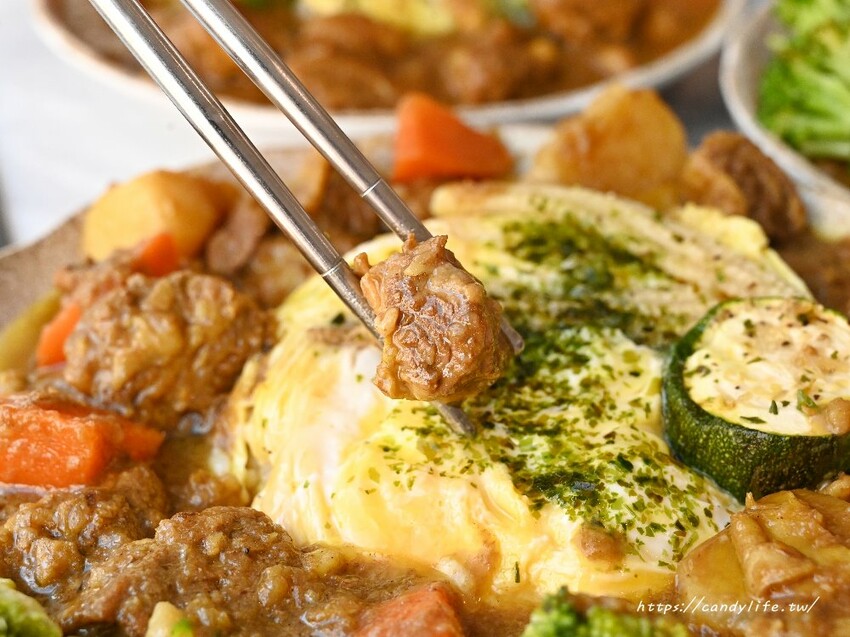工匠料理 慢熬咖哩x烤時蔬的港式牛肋咖哩飯是採用洋蔥、紅蔥頭、月桂葉、二荊條 、綠豆蔻等10幾種香料磨成粉末後熬製而成的咖哩醬汁,顏色比較偏深色,糖糖還額外加倍肉量及滑蛋,整碗看起來超澎派,裡頭除了牛肋條,還有花椰菜、紅蘿蔔及馬鈴薯