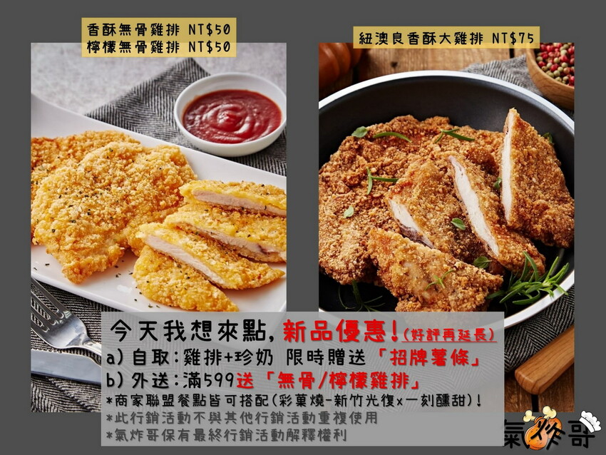 氣炸哥說他的新品雞排上市,給大家好評優惠!