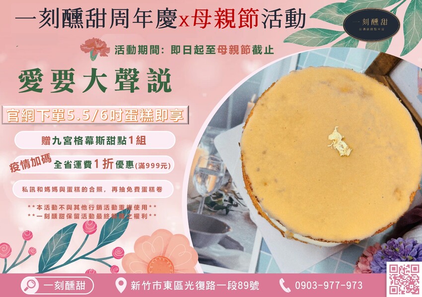 即日起至母親節截止,只要訂購5.5/6吋的蛋糕即享九宮格幕斯甜點1組,再疫情加碼全省運費1折優惠🎉