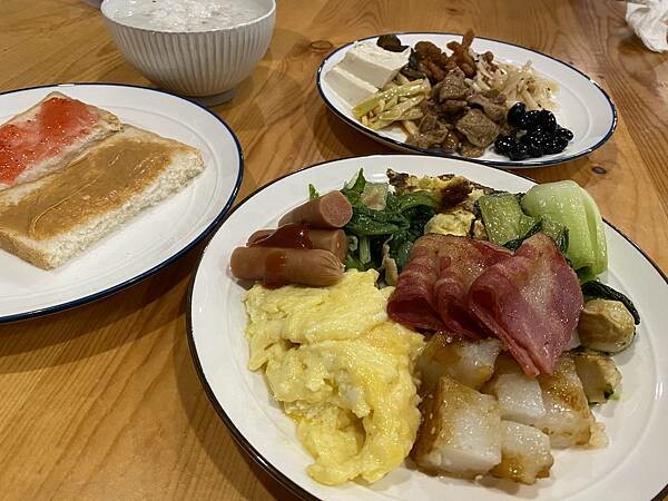 早餐有烤麵包有花生醬、草莓醬、巧克力醬可做搭配