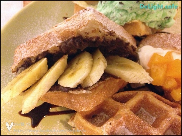 滿出來的香蕉切片與濃稠的巧克力卡士達醬,吃起來不會很甜膩,配上微熱的香甜鬆餅一起吃,味道也很搭!