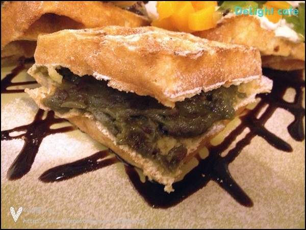 大小直接用手拿起來吃剛剛好,表皮烤得有一點酥脆,鬆餅製作看得出來很費工夫,除了要烤得恰恰好外,趁熱將鬆餅中間切開,夾入豐富的配料,每一口咬下都可以吃到滿滿的鬆餅香,外面撒上糖粉,底盤還有巧克力醬可沾取享用。