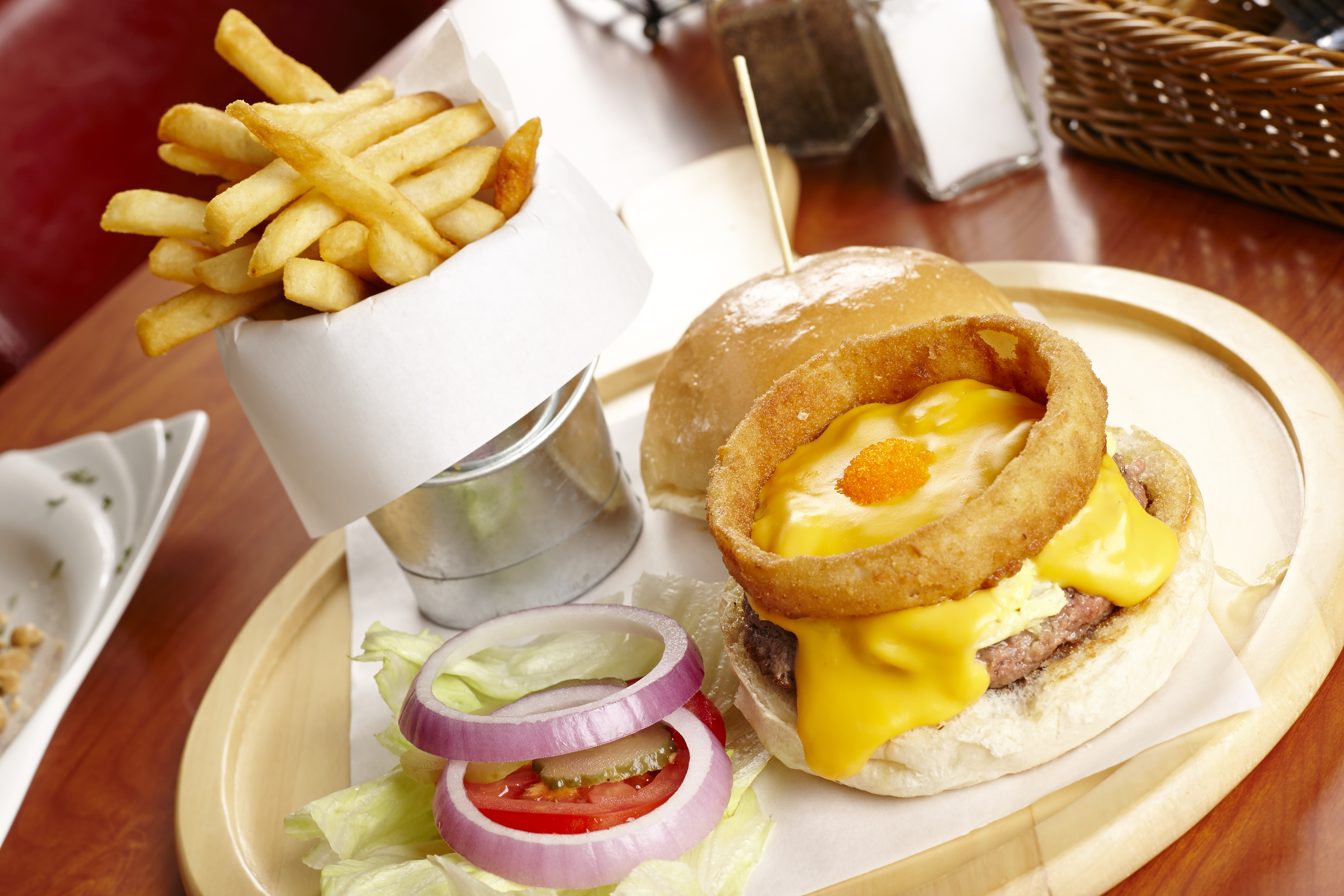 每天手工現做的漢堡排,肉質紮實飽滿,搭配加入起司的半熟炒蛋,更是香氣四溢,加入切達起司片、洋蔥圈和生菜,最後加上些許明太子增添口味層次,口味更富變化,搭配附餐薯條,超值份量令人大快朵頤。