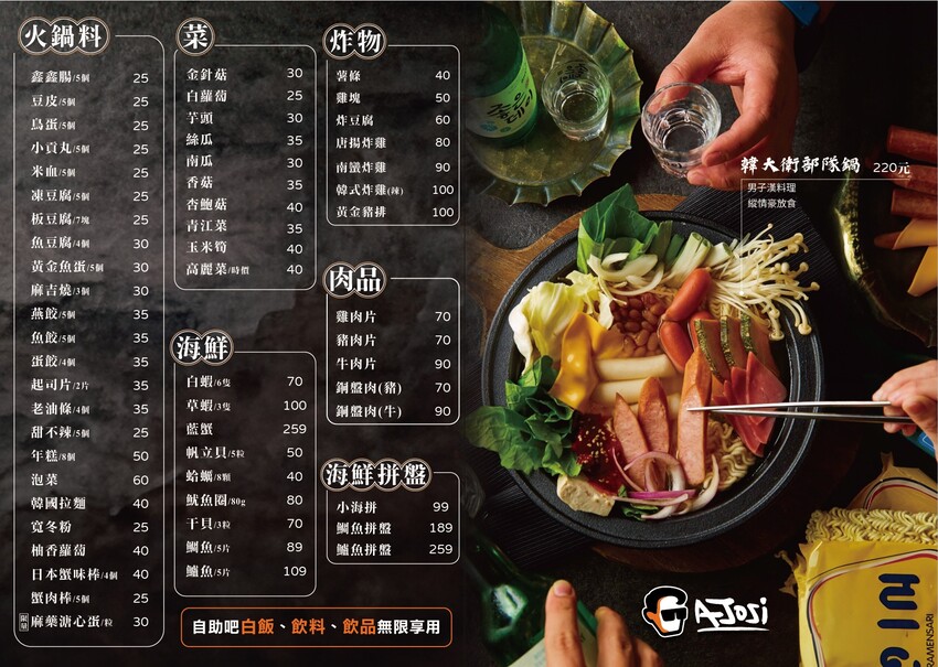 AJosi韓式火鍋台中東興店菜單,第一面是各種鍋物