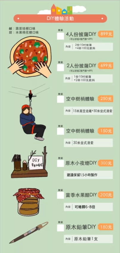 可愛動物區、水果披薩DIY、水果蜜餞、水果醋、鉛筆DIY、鐵牛車…