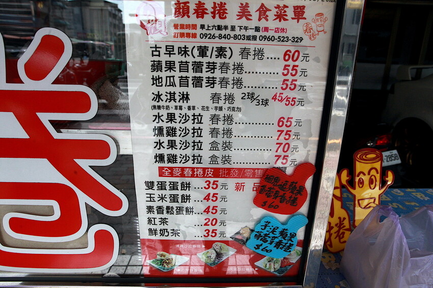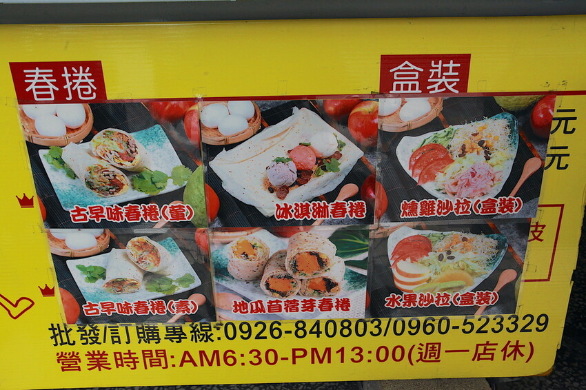 菜單上有春捲類、蛋餅類及飲料類供客人選擇,春捲總共有8種口味訂價稍微偏高。