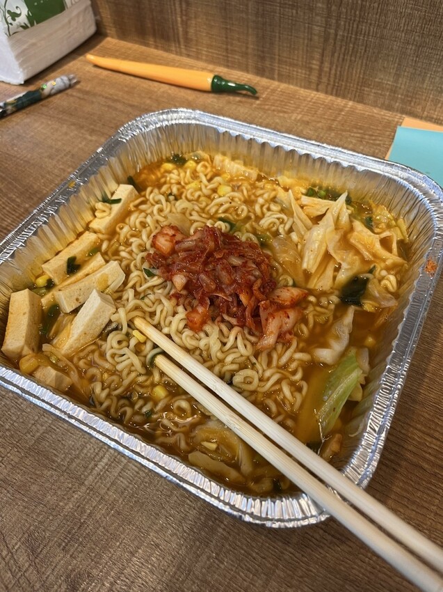 我的麵煮好上桌囉!! 到配料區加一點韓式泡菜更夠味