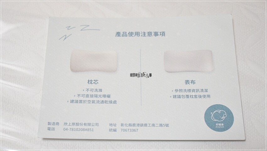 店家還附上貼心產品注意事項,表布可以洗水,枕芯不可以洗滌,放置空氣流通乾燥處即可