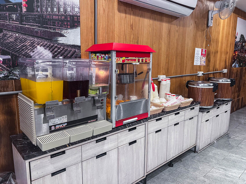 後方是自助區,白飯、飲料、熱湯、餅乾都是無限量供應,一旁還有椒鹽、辣菜圃等調味料可以自己裝