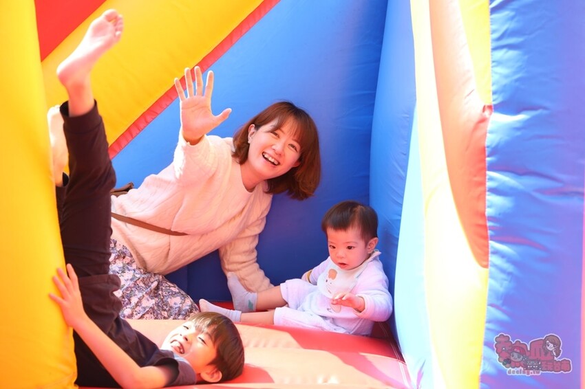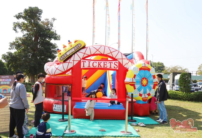 小孩一見就瘋狂的遊樂園充氣氣墊真的會玩瘋了,小朋友超好放電,大人也可以趁機好好逛市集,選購行李箱,重點是!玩充氣氣墊是完全免費的喔~