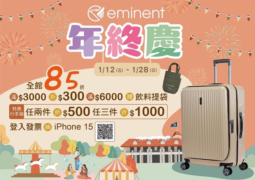 生活館限定特惠行李箱任兩件折$500、任三件折$1000,全館更推出85折優惠,滿$3000折$300,滿$6000送飲料提袋登錄發票還能抽iPhone 15~