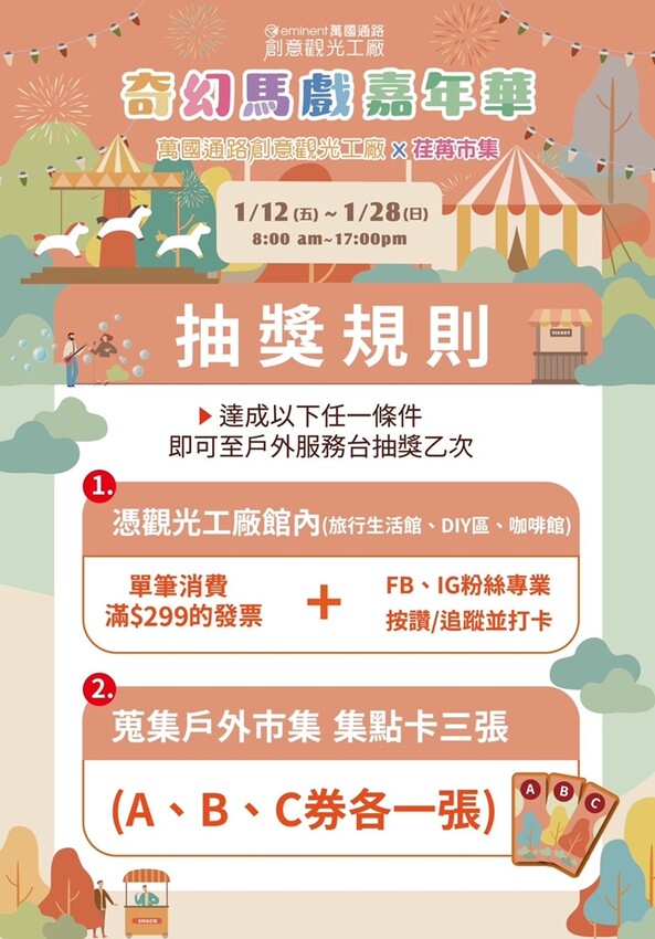 2.蒐集戶外市集A券、B券、C券各一張,並組合完成+公開分享貼文至FB、IG限時動態(至攤位單筆消費即贈一張抽獎券)
