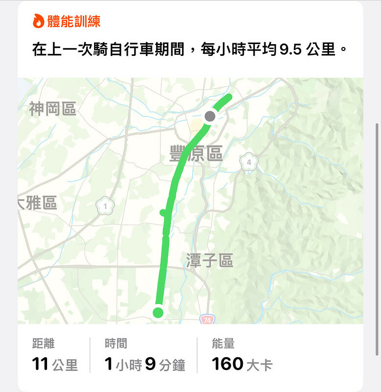 來看看當天的實測結果,綠空廊道從松竹車站到豐原車站大約接近11公里囉~