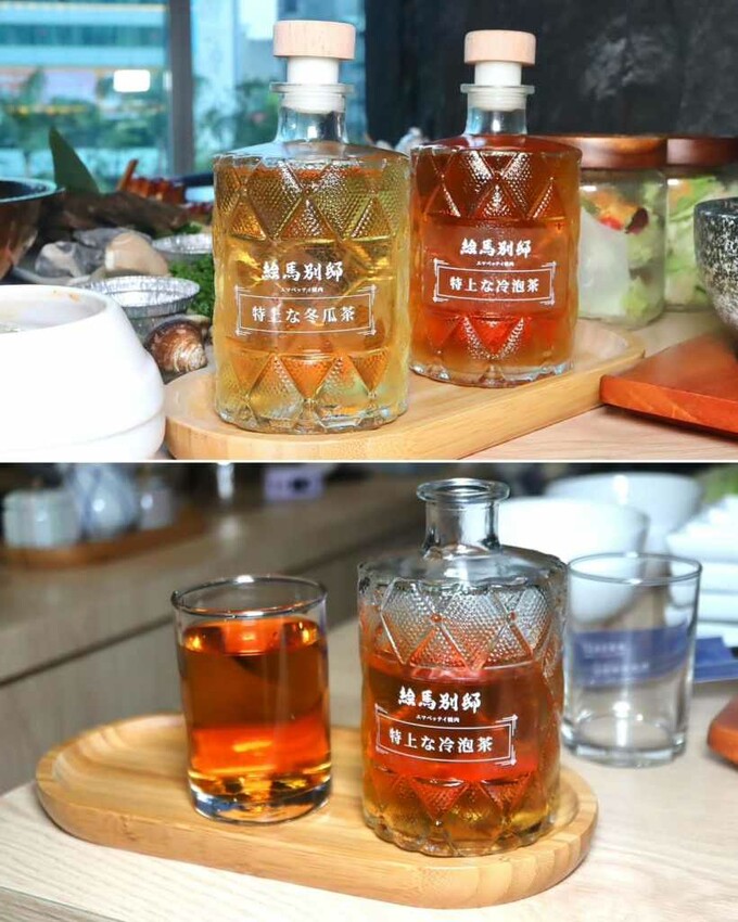 ▼飲料選項有五種,可以選兩種無限續超讚!!而且瓶子看起來真的超級有質感啦!還以為在喝威士忌咧~這樣倒出來喝特別有種假掰的儀式感XDDD (我好愛哈哈哈哈哈)