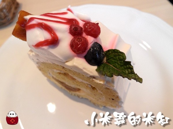 中間還堆疊了打發的鮮奶油、榛果杏仁奶油及手指餅乾