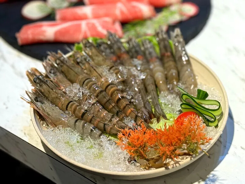 蝦子海鮮類菜色中的主角之一。饗點鍋「蝦蝦部隊」有白蝦6尾、草蝦6尾,新鮮看的見,蝦肉新鮮彈牙可口,好想再叫一盤啊
