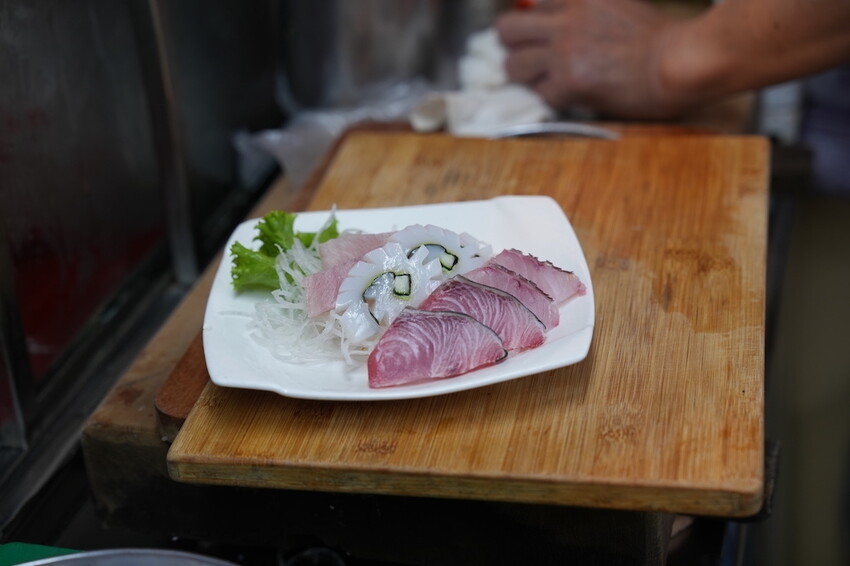 一般比較常見的生魚片是鮭、旗、鮪魚等等,五郎則大都用較小型的現流鮮魚