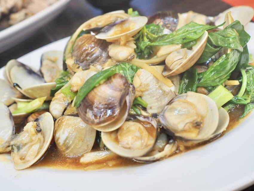 塔香蛤蜊顆顆多汁飽滿不乾扁,九層塔起了增鮮提味、辣椒微辛感,適時的蒜香也點綴出蛤蜊的自然海味。