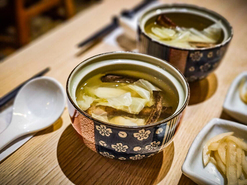 料理都是現點現做,等待的同時店員也送上三品小菜跟烤鰻骨湯,鮮美濃郁、菇料蔬菜豐盛的湯頭清甜好喝,冬天來上一碗暖暖的