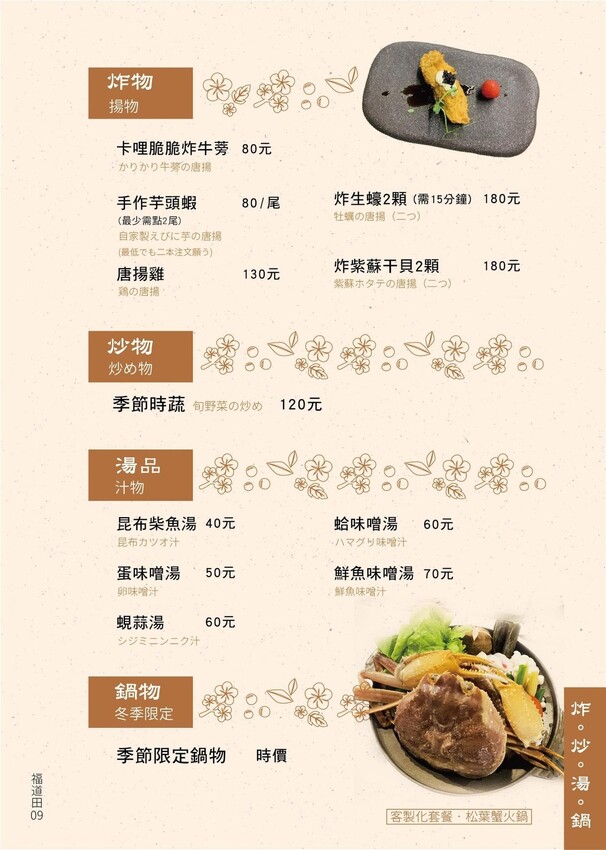 前菜、烤物、炸物、炒物、湯品、鍋物、飲品和酒精飲料….等