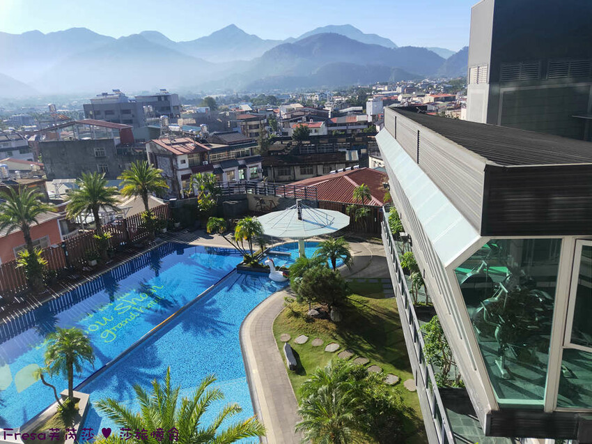 飯店房間大,擁有專屬陽台,遠望山景及泳池.